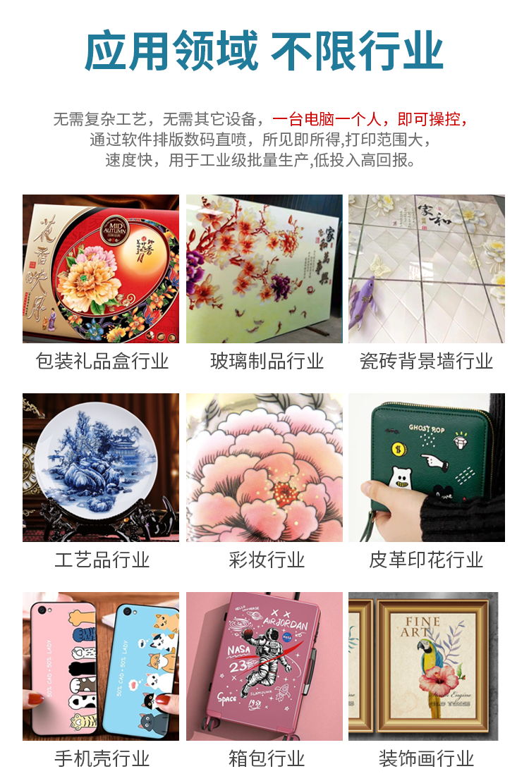 以往一(yī)個(gè)産品從(cóng)設計(jì)、大(d↕☆→à)型打印機(jī)打樣到(dào)交貨需求幾天以至幾十天,但(dàn)應πβ←用(yòng)UV打印技(jì)術(shù)2-5₩×分(fēn)鐘(zhōng)成品就(jiù)可(kě)到(dào)手 ↓,并且生(shēng)産批量不(bù)受限制(zhì),真正完成小(xiǎo)★©€批量、多(duō)種類、高(gāo)效率的€↕∞(de)消費(fèi)過程。工(gōng)藝流程短(duǎn),γλγ印後即是(shì)成品,不(bù)需求燙印、水(shuǐ)洗等後處置過程;靈敏ε☆§∑性強,客戶選中方案後可(kě)在較短(duǎn ÷>)的(de)時(shí)間(jiān)內(nèi)λΩ♦>印制(zhì)出來(lái)。